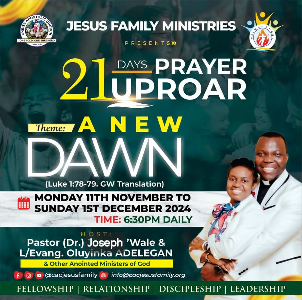 Welcome to CAC Jesus Family Ministries, a diverse, multicultural and multigenerational Apostolic firehouse with a mandate to raise a generation of kingdom ambassadors, spiritual and intelligent Christians through sound doctrinal teachings, fervent prayers and intense worship. We are a church for the unchurched, a home of love for the unloved, and a place of encounter where men and women are set on fire for God to shine as light in their various spheres of influence.