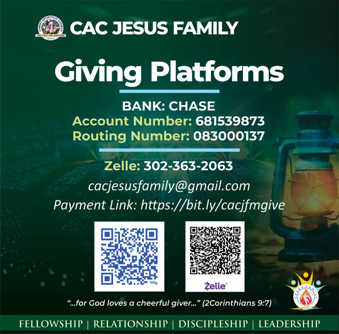 Thank you for visiting the Online Giving page of the CAC Jesus Family Ministries. This is our secure platform through which you can make online payments of your offerings, tithes and special offerings into the Kingdom of God. We believe that as you sow your seed, the Lord will multiply it back to you a thousand fold.